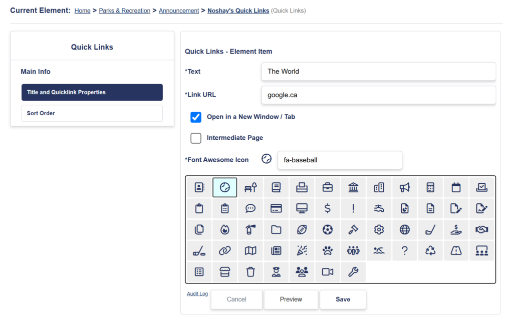 - Create Quick Links – Adding Quick Links is as simple as creating a new page. You can manage, edit, or reorder quick links like any other site content type. You also have access to new Fontawesome icons and can add your own.