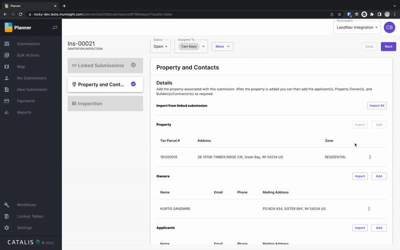 You can link submissions to each other. This will allow complex inspections that need their own workflow to be linked to other submissions. For instance, in cases when a sanitation permit need to be inspected every three years, call those items can be linked together for easy review.