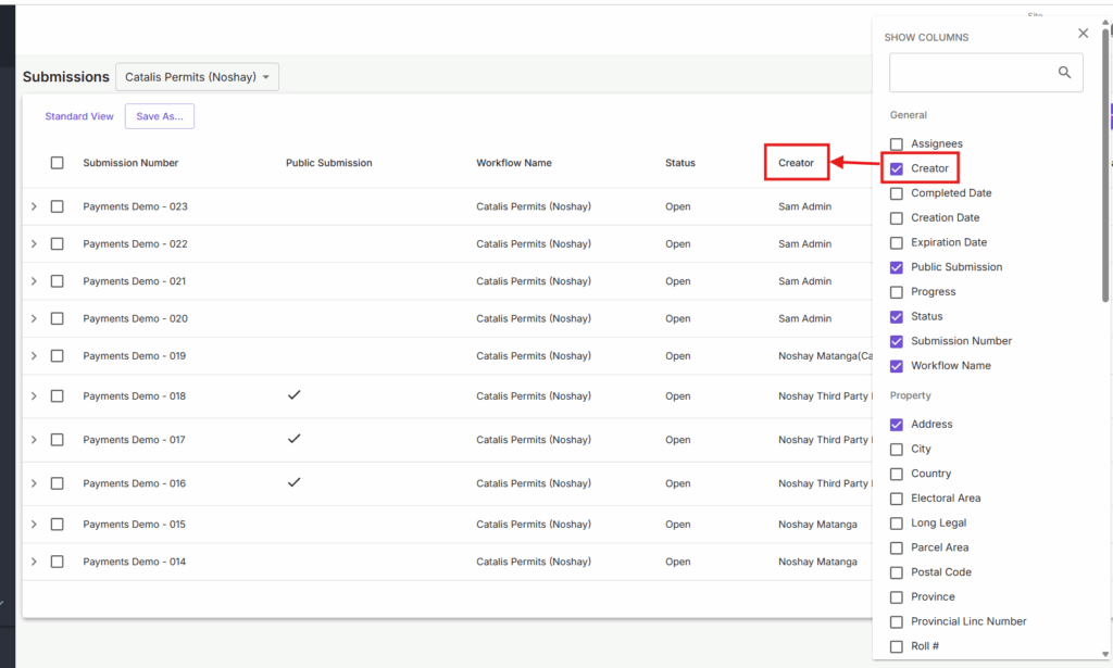 - New Creator Column: You can now see who created each submission directly in the Submissions table. The column supports search and filtering, so you no longer need to contact support to find this info.