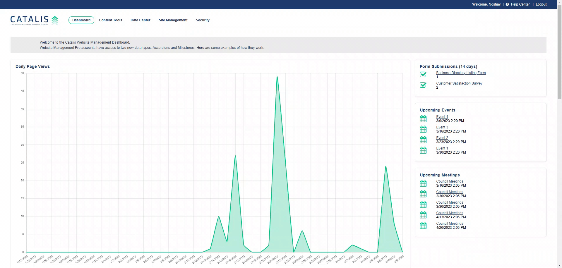 - Admin users can also see upcoming meetings, events, open form submissions, and payment orders.